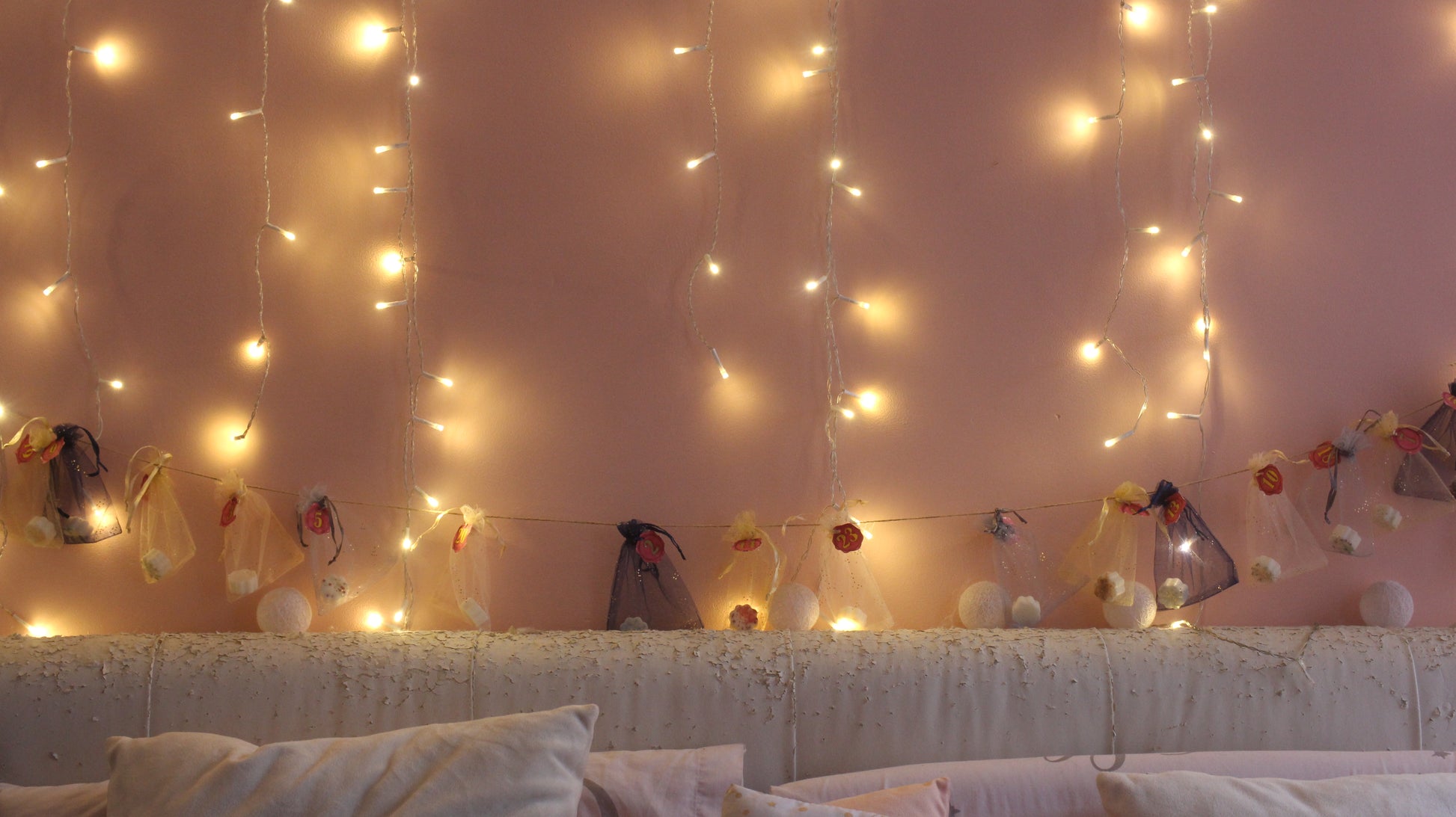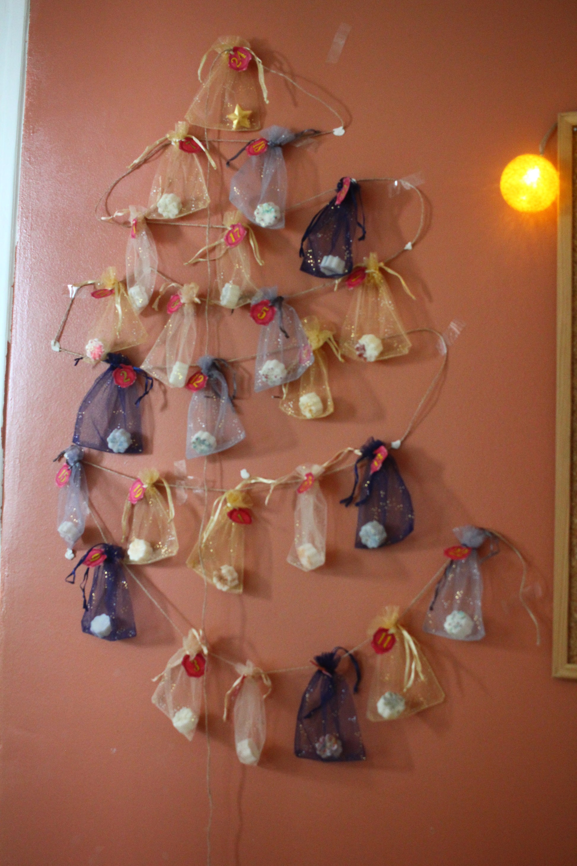 Envie d'un Calendrier de l'Avent qui sort de l'ordinaire ? Alors tu es au bon endroit, je te propose un calendrier que tu peux moduler à ton envie. Il est composé de vingt-quatre pochons contenant des petits fondants aux odeurs de Noël et d'une corde. Maintenant place à l'imagination, munis toi de punaise et crée la forme que tu veux pour accrocher tes fondants. Tu peux aussi les laisser dans la boîte et chercher ton pochon chaque jour.